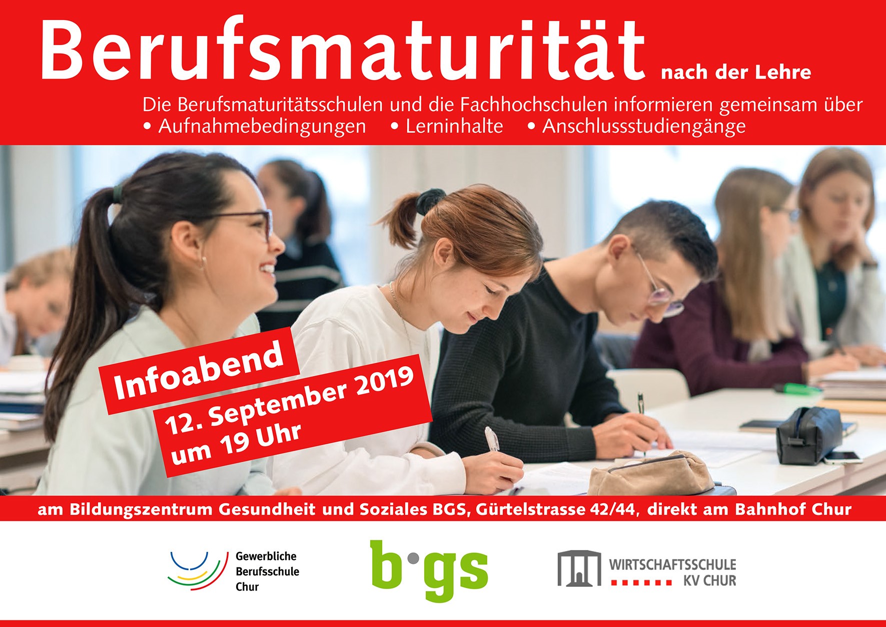 Am 18. September 2019 findet am BGS eine Infoveranstaltung zur Berufsmaturität Ausrichtung Gesundheit und Soziales statt. Wir informieren über die Berufsmaturität während und nach der Lehre.